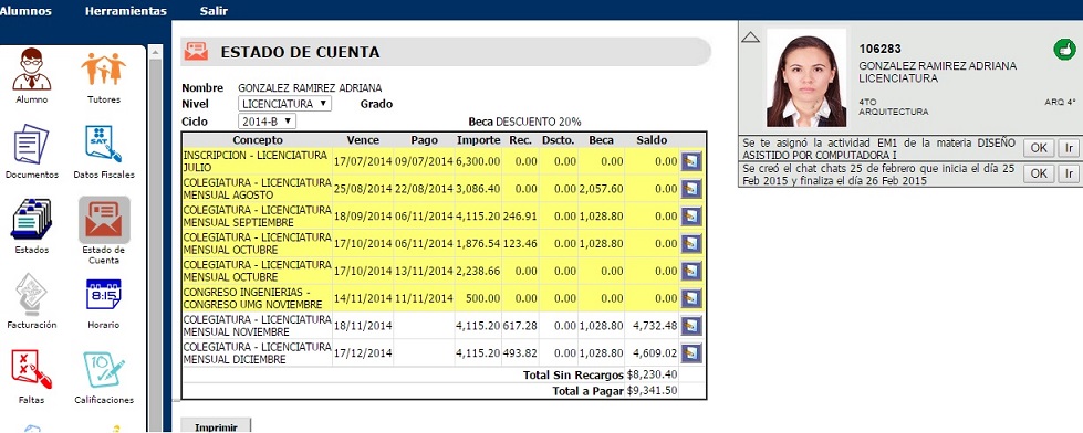 | Se puede el consultar el estado de cuenta del alumno del ciclo activo, mostran las fechas de pagoy adeudos. Se pueden imprimir estados de cuenta para ser pagados en los bancos, este contrato debe ser realizado entre la escuela y la institución bancaria. | |