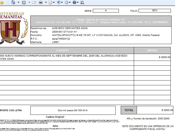 Un ejemplo de como ve el alumno su factura para su impresión se muestra a continuación. Al igual que todo el sistema las facturas tambien son personalizadas.